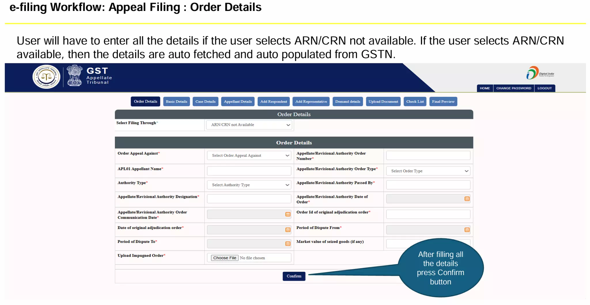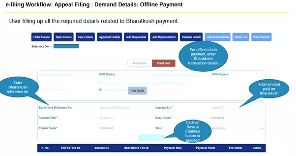 The process involves entering order details, furnishing party and demand particulars, uploading supporting documents, and completing payments either online or through Bharatkosh. .