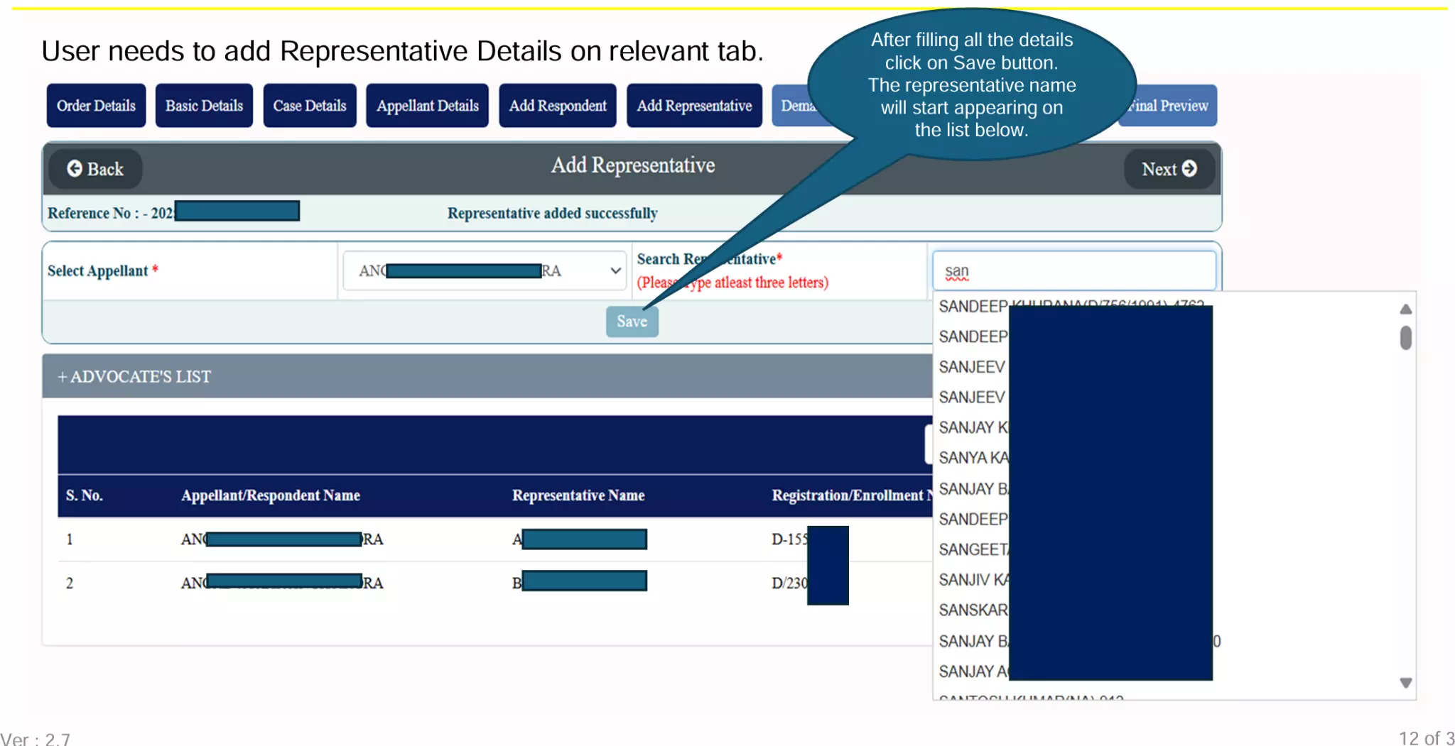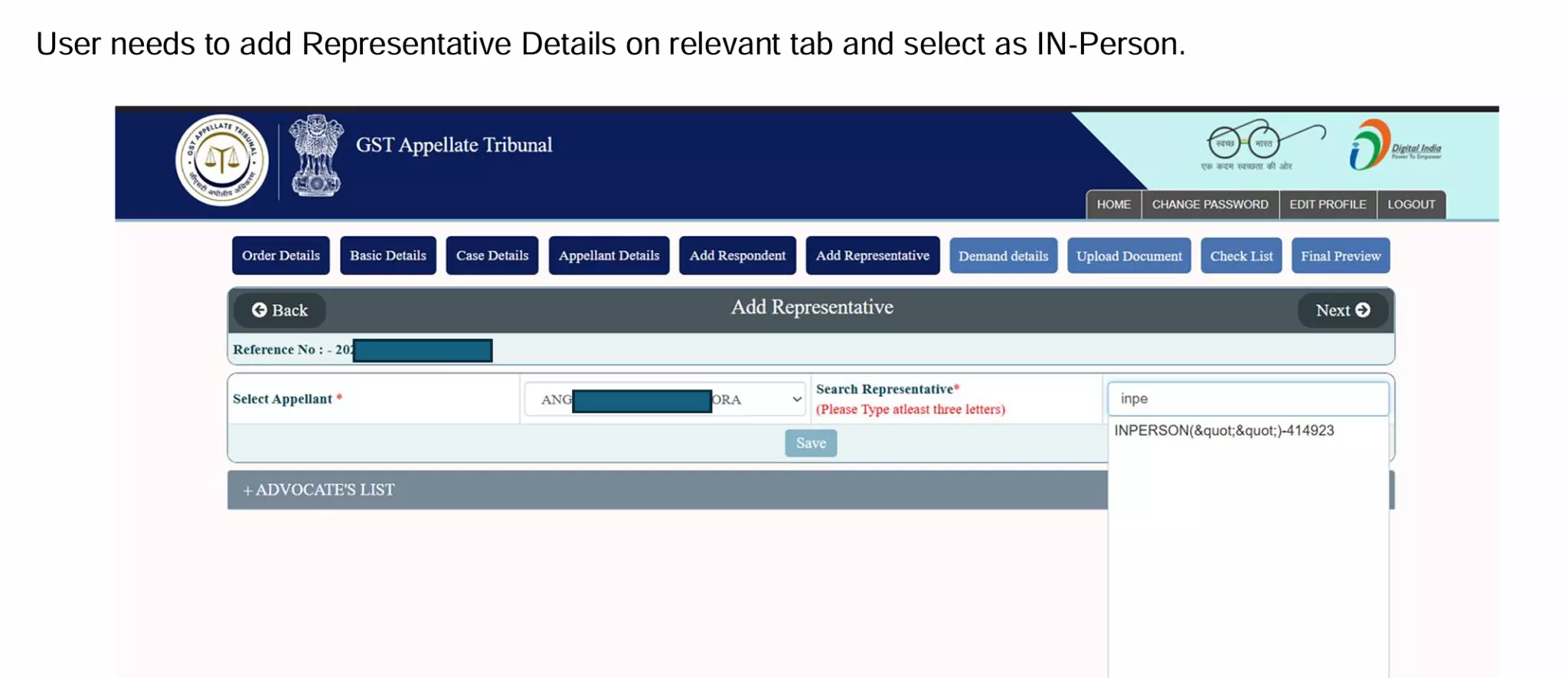 Add Representative details or mark as “In Person”.