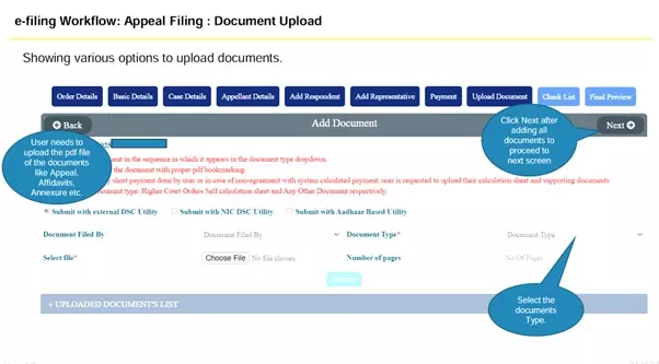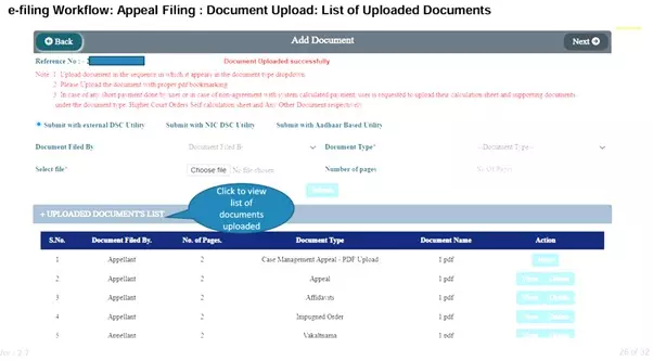 Upload PDF documents: Appeal, Affidavits, Annexures, etc.