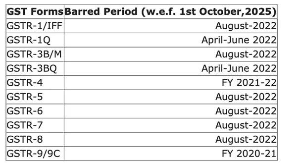 Illustration : For ease of reference and better clarity, the latest GST returns that will be barred from filing w.e.f 1st October 2025 are detailed in the table below: