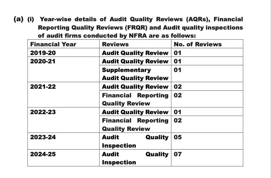 In FY 2022-23, NFRA performed 1 AQR and 2 FRQRs and In the subsequent years, NFRA moved to full-scale Audit Quality Inspections, carrying out 5 inspections in FY 2023-24 and 7 inspections in FY 2024-25, the highest in the five-year period. The total of these reviews and inspections is 19.